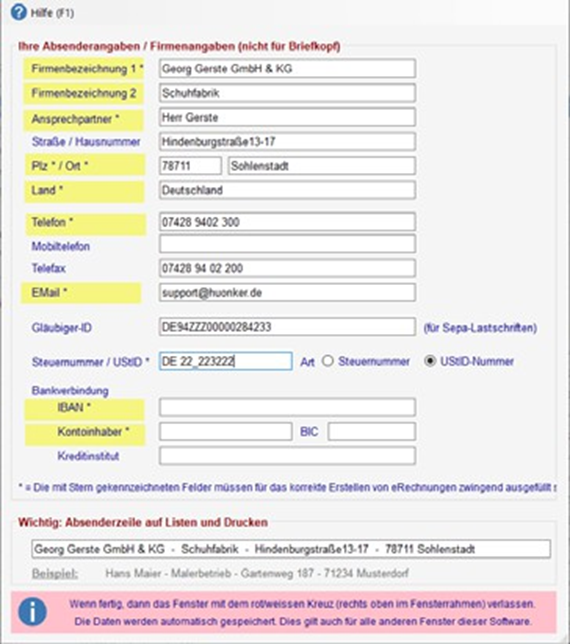 3. Die Bankverbindung des Rechnungsstellers ist zwingend erforderlich. Dazu wurden im Fenster der Absenderangaben weitere Felder hinzugefügt.