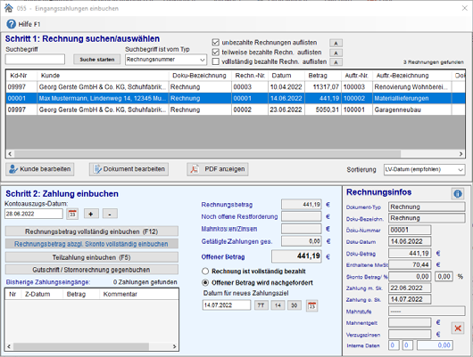 Oben im Feld unter „Schritt 1“ werden beim Betreten des Fensters automatisch alle offenen Rechnungen angezeigt. Falls Sie einen Kleinbetrieb haben, bei dem nur wenige Rechnungen offen sind, klicken Sie in dieser Liste die einzubuchende (bezahlte) Rechnung an. Rechts unter „Rechnungsinfos“ finden Sie die detaillierten Informationen zu der Rechnung.