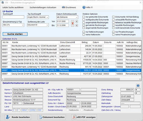 Unten in der Liste sehen Sie dann das Suchergebnis. Jeder Eintrag ist ein LV-Dokument (z.B. Angebot, Rechnung, Lieferschein, Gutschrift usw.). Wenn Sie einen Eintrag in der Liste anklicken, finden Sie ganz unten unter „Detailinformationen zum ausgewählten LV“ die genauen Details des markierten Dokumentes.