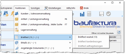 Wenn Sie ein LV (also z.B. ein Angebot oder Rechnung) offen haben, stehen Ihnen natürlich auch alle 3 Bereiche zur Verfügung. Möchten Sie speziell für den aktuellen Auftrag (Baustelle) z.B. einen Brief oder ein EMail schreiben, wird dieser auftragsbezogen erstellt.