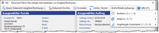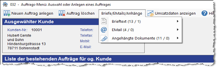 Nachdem Sie in der Adressenverwaltung einen Kunden ausgesucht haben, gelangen Sie in das Auftragsfenster. Hier befindet sich rechts oben in der Menüleiste der Eintrag „Briefe/E-Mails/Anhänge“.