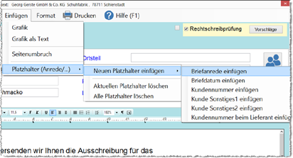 Insbesondere sinnvoll für Rundschreiben - aber auch für normale Briefe sind Platzhalter. Wird z.B. der Platzhalter für die Briefanrede eingefügt, erscheint automatisch die in der Kundenverwaltung hinterlegte Briefanrede („z.B. Sehr geehrter Herr Schuster,“).