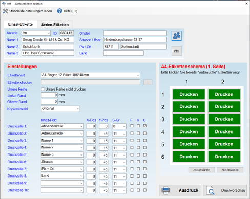 Das Etikettensystem ist voreingestellt. Bevor Sie detaillierte Einstellungen verändern, sollten Sie zunächst nur die „Etikettenart“ und den „Etikettendrucker“ einstellen. Dann probieren Sie den Druck. Evtl. sind dann lediglich korrekturen am „Linken Rand“ oder „Oberen Rand“ zu tätigen, falls die Randabstände zu klein oder zu gross sind.