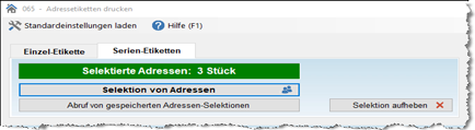 Um die gemachten Selektionen in Briefe, EMails oder Etiketten abzurufen, gibt es, wie schon vorher erwähnt, in allen 3 Modulen den Punkt „Abruf von gespeicherten Adress-Selektionen“.