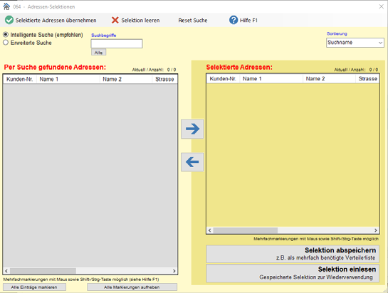 Mit der Schaltfläche „Pfeiltaste rechts“ mitten im Fenster können Sie die markierten Adressen nach rechts in die Selektionstabelle verschieben.