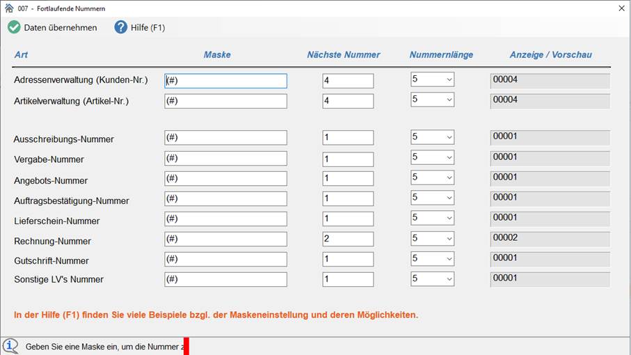 Die Nummernlänge gibt an, auf wie viele Stellen die Nummer formatiert wird. Möchte man z.B. immer eine Länge von 5 Zeichen, stellt man dieses hier entsprechend ein. Aus der Zahl „45“ macht das System dann „00045“. D.h. die Zahl wird durch führende Nullen aufgefüllt.