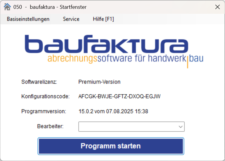 Die Einstellungen finden Sie im Startfenster von Baufaktura.