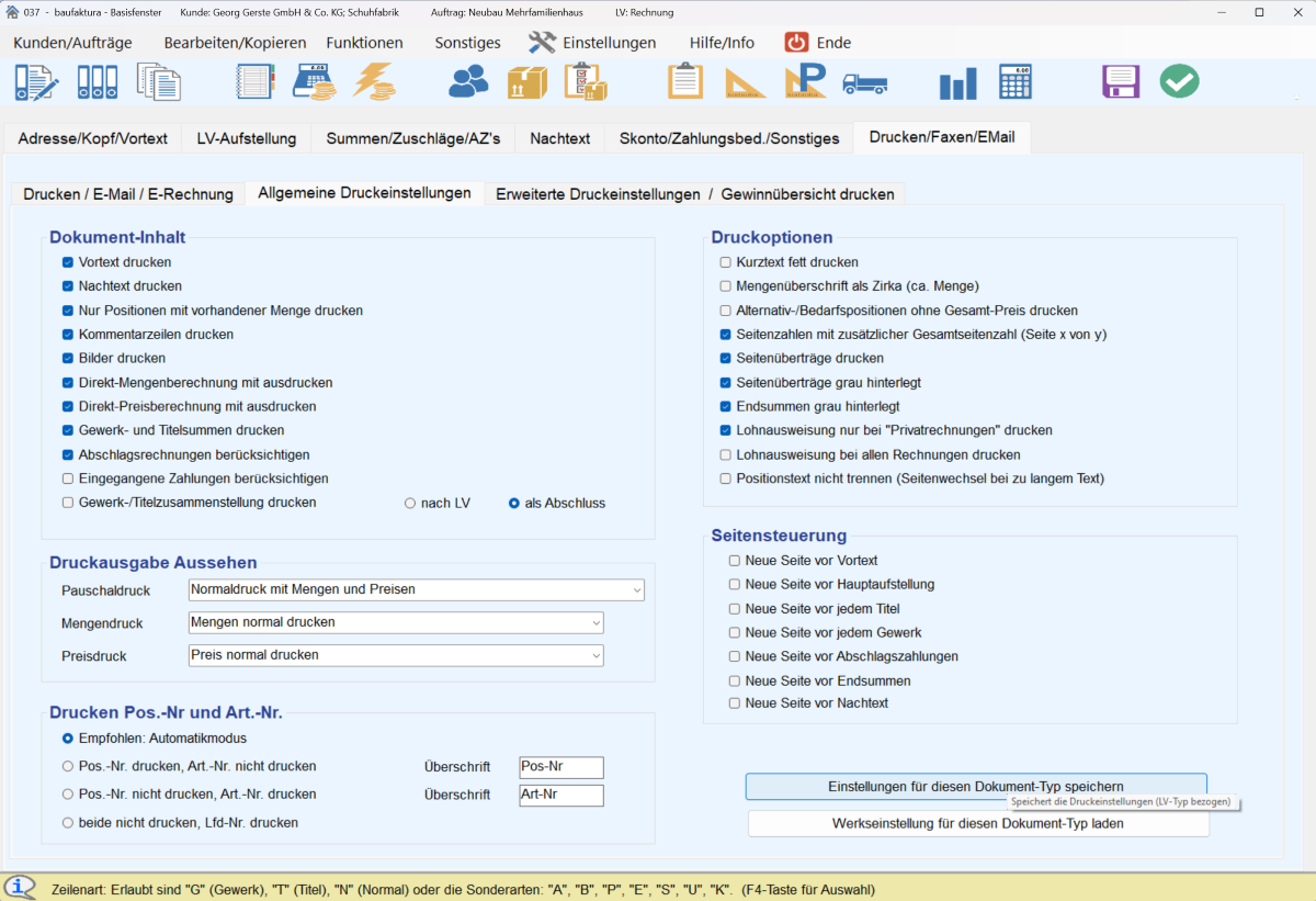 Bitte berücksichtigen Sie, dass die vorgenommenen Einstellungen nur für den aktuellen Dokumententyp gelten.Sie nehmen Änderungen in den Druckeinstellungen in Baufaktura wie folgt vor: