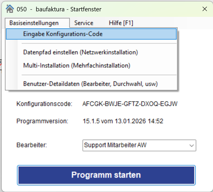 Geben Sie Ihre Postleitzahl und Ihren Konfigurationscode ein und klicken auf die Schaltfläche „Codeeingabe bestätigen“. Danach schließen Sie das Fenster und klicken auf „Programm starten“. - Nach der Installation wählen Sie im baufaktura Startfenster oben im Menü den Punkt „Basiseinstellungen“ und „Eingabe Konfigurationscode“.