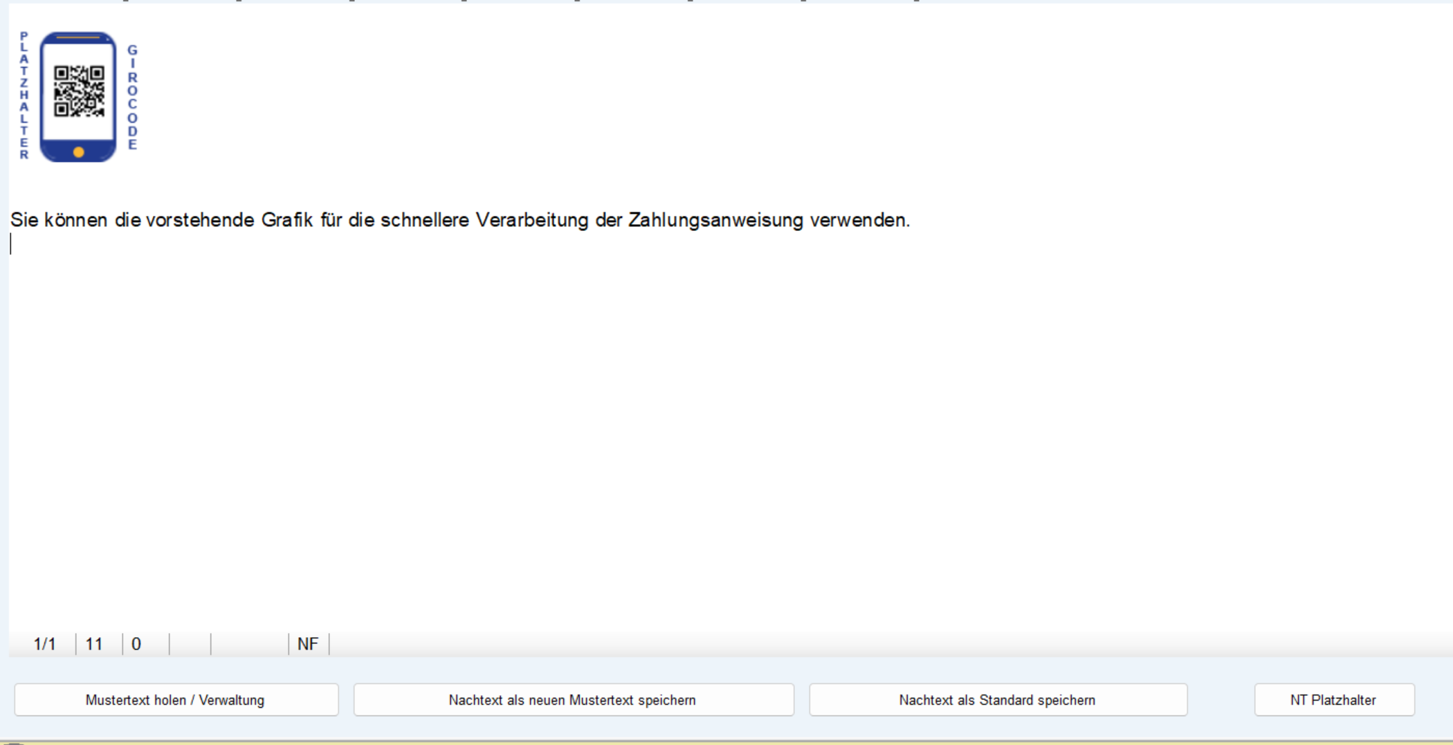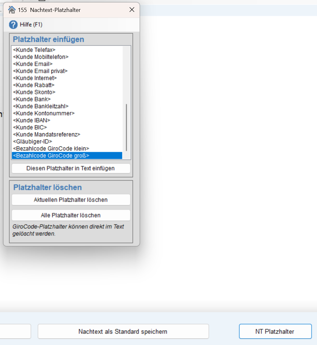 Verwenden Sie im Nachtext zu Rechnungsdokumenten einen Platzhalter (im unteren rechten Bereich des Fensters)